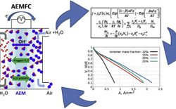 We present a new model for anion exchange membrane fuel cells. Validation against experimental polarization curve data is obtained for current densities ranging from zero to above 2 A cm−2. Experimental transient data is also successfully reproduced. The model is very flexible and can be used to explore the system's sensitivity to a wide range of material properties, cell design specifications, and operating parameters. We demonstrate the impact of gas inlet relative humidity (RH), operating current density, ionomer loading and ionomer ion exchange capacity (IEC) values on cell performance. In agreement with the literature, high air RH levels are shown to improve