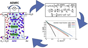 We present a new model for anion exchange membrane fuel cells. Validation against experimental polarization curve data is obtained for current densities ranging from zero to above 2 A cm−2. Experimental transient data is also successfully reproduced. The model is very flexible and can be used to explore the system’s sensitivity to a wide range of material properties, cell design specifications, and operating parameters. We demonstrate the impact of gas inlet relative humidity (RH), operating current density, ionomer loading and ionomer ion exchange capacity (IEC) values on cell performance. In agreement with the literature, high air RH levels are shown to improve cell performance. At high current densities (>1 A cm−2) this effect is observed to be especially significant. Simulated hydration number distributions across the cell reveal the related critical dependence of cathode hydration on air RH and current density values. When exploring catalyst layer design, optimal intermediate ionomer loading values are demonstrated. The benefits of asymmetric (cathode versus anode) electrode design are revealed, showing enhanced performance using higher cathode IEC levels. Finally, electrochemical reaction profiles across the electrodes uncover inhomogeneous catalyst utilization. Specifically, at high current densities the cathodic reaction is confined to a narrow region near the membrane.